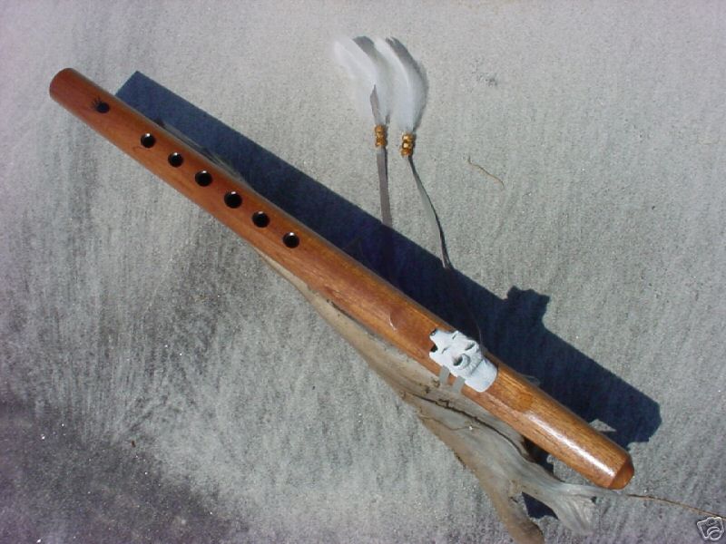 This flute will play with the SLIGHTEST breath!!! Crow beads hold the feathers in place. Tuned using Virtual Strobe to absolute perfection. When I tune these flutes I am looking down the barrel at three different style tuners! UNBELIEVABLE CLEAR Concert Quality Voice, money back guarantee!!! Hear this AWESOME flute for yourself @ Swampfoxflutes.com very soon to come, or send me an email, even if you only want to listen........ :))
