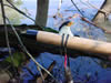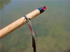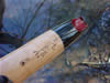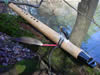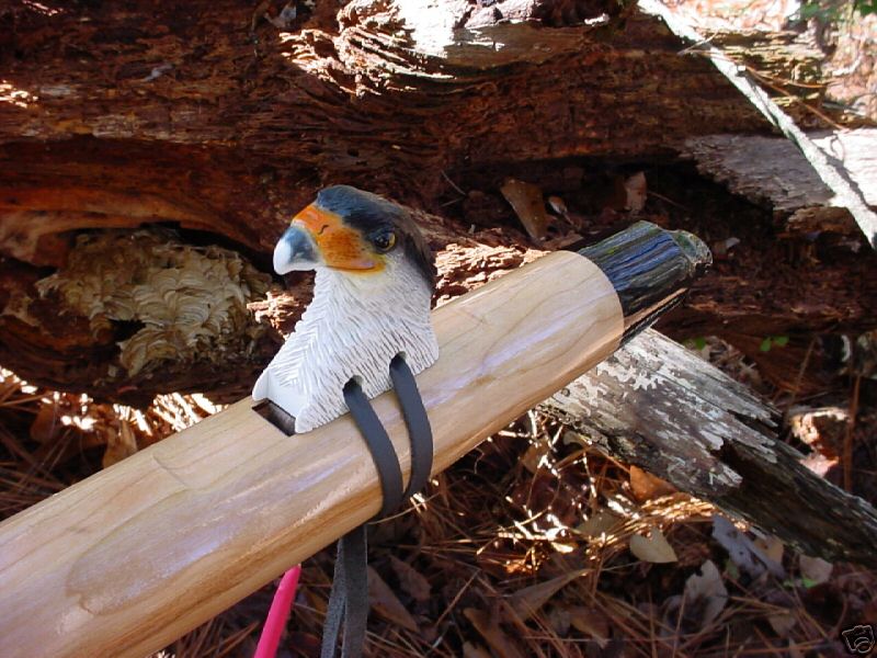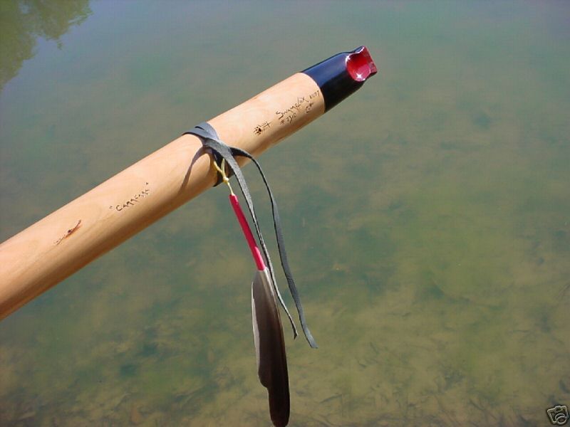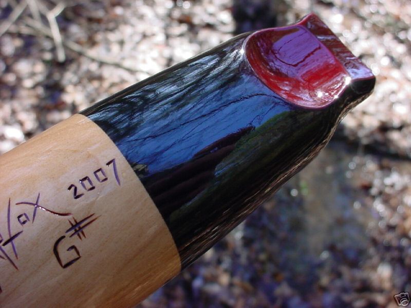 Mega-Mega Bore Pennsylvania Black Cherry Flute is keyed to Max Low G# with a bore dia just under two inches and a length of approx. three feet!!!! Features: Mark of Creator in a Fox track feather, flight feather, my dished finger holes, a mouthpiece of your dreams - so comfortable the flute becomes an extension of yourself - and this mouthpc is dished to rest on your chin if you like!!!