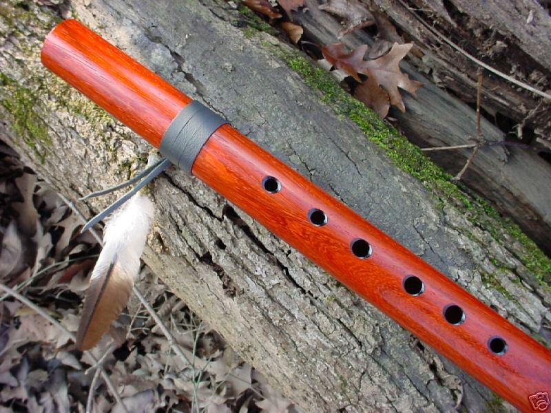 Exotic Padauk flute is keyed to LOW Cm... This MEGA-BORE weighs in @ approx 29" in length, a Giant with a very deep clear beautiful voice!!! Absolutely the best mouthpiece money can buy! Now this is the wonderful thing about this flute: Normally in a flute of this GIANT size, it takes a great amount of air flow to keep the flute in song...More than most people can sustain...I have remedied this problem, and this flute will play with the SLIGHTEST breath, much similar to a Swampfox G#, ( a medium sized flute)...Feather is not painted but natural color and is one of only two from my son Justin Dancing Bear's collection. Tuned using Virtual Strobe to absolute perfection. When I tune these flutes I am looking down the barrel at three different style tuners! UNBELIEVABLE CLEAR Concert Quality Voice, money back guarantee!!! Hear this AWESOME flute for yourself @ Swampfoxflutes.com very soon to come, or send me an email, even if you only want to listen........ :))