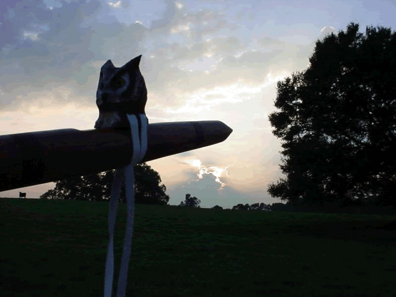 The flute was constructed and all it needed was a totem. I looked to the sky, to the woods, and finally to the water. Still, there was nothing my friends! It is when this happens that I know in my heart the Creator has something special in mind! That night I was puzzled as I went to sleep as to what this flute would carry as it's totem. It was 2:30am when I heard the sound. Like a woman screaming for her life! If I hadn't heard this so many times before, I would have probably called 911. :)) Now you have to love doing this stuff to crawl out of bed with a beautiful woman snuggled next to you, (don't tell Karen about this)...Just kidding, it was her!..hehehe... but I had to see this creature with my own eyes! I quickly grabbed my Streamlight, and eased out of the back door and into the night. It was cool out for a change, and a slight fog had rolled in from the water. I waited until I had heard the sound once more then slipped into the brush to get closer before turning on the light. The moon was as big as I have ever seen it that night! I could see the outline of the creature which looked like a winged Tiger against the bright night sky. Without a doubt, it was the Great Horned Owl!!! Around here we call them the Tiger of the Woods! And there is a good reason for this my friends!! Hardly anything that moves is safe from this Owl!!! They will scan for prey thru the night, and have been known to take young alligators, domestic cats, woodchucks, geese, Great Blue Herons, rabbits, birds, fish, amphibians, and anything else that it wants to eat! It has one of the most POWERFUL Grips with it's feet of any of the owls! There have been reports of Great Horned Owls taking Red Tailed Hawks, and they will eat anything from crayfish to young foxes, sometimes taking prey 2 to 3 times heavier than itself. There was once a report of one here in the South that walked into a chicken coop and had itself a chicken sandwich!