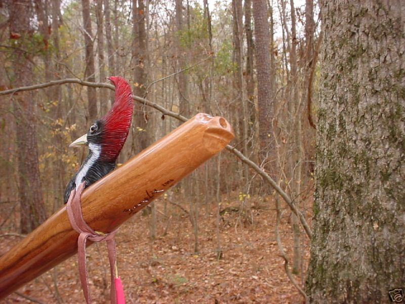 During this flute's time my Father was over for a visit. We were actually talking about this flute, when a Large Pileated Woodpecker swooped thru the sky in an up and down motion, flying South to North!! It was the Ivory Bill's little Brother - and to honor him, the wonderful day, and my Father, I have hand carved and painted this totem!
