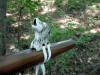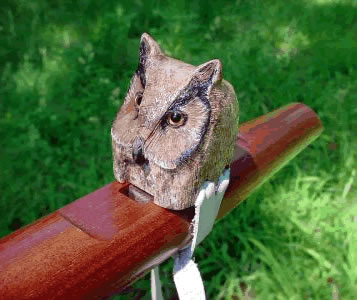 At the break of day, I went out to see what was stirring around here. It was the day this flute would come to be. I needed a totem my friends. Sometimes I will go to great lengths to find the totem meant for a particular flute. You cannot walk out of my door without seeing some sort of animal, but this morning I had a good feeling that I would be shown a great sign. This flute would be special indeed. As I sipped my coffee a very large shadow swiftly moved across the grass. When I looked up, there, just overhead flew a magnificent creature! His wings did not beat, but were held straight out from it's thick body. Ghost like, not a sound was heard. And when it landed only yards away, I could see that is was the Giant Great Horned Owl. Often called the Eagle Owl it is exceeded in size only by the rare Great Grey Owl. This massive creature had huge yellow eyes and very strong legs with big sharp talons - everything needed to launch an attack on either prey or intruders! His voice was as deep as the flute itself!!! With me in the picture, the bird's stay was brief. He departed in a NW direction. Here in the South, these Owls truly grow to be Giants!