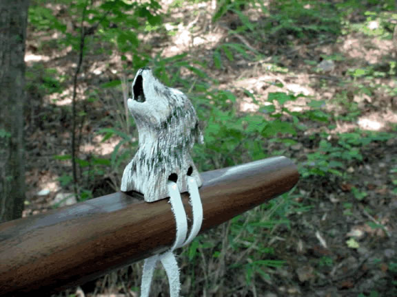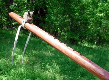 On a Georgia morning, I had no idea what totem would be chosen for for this Walnut flute as it spun on the lathe! A cool wind came out of the South which helped to keep the flying walnut chips from my face. Stopping to get another tool, my eyes caught movement at the edge of a wood-line on a beautiful green grassy knoll. It was my Wolf friend "Pathfinder", a beautiful creature that someone surely decided to part with, but 100% wolf! I have tried many times in the last months to tame him, but he has decided to live the old ways. Sometimes I have found myself wanting to follow him to see where he goes for weeks at a time. On one such morning I had been kayaking in a nearby swamp and upon reaching a shore, I could clearly see his "larger than life" tracks in the soft mud which would dwarf any dog living in this area! Sit back, and let me tell you a true tale of a purification ceremony where a hunter, Swampfox (me), in pursuit of my past, found that I myself had become the prey! You might ask how I have received this gift of tracking an animal, and I'd answer, my Great Grandfather, and Grandfather, and Father! Many times my elders have been called to find a deer or other animal that a hunter would have never found otherwise. Now I know some folks are against hunting, but both of my Grandfathers fed their families in this way. It is very similar to someone going to the grocery store and buying a chicken, except they went to the woods and brought home a deer. Both chicken and deer gave their lives, but most likely the deer was the only one which the Creator was given thanks for... Even if you are a vegetarian, the plants you eat have given their life for you, and so it is with most everything we eat. As I stepped out of the kayak, for an instant I had a creepy feeling that something was watching me. Glancing around, nothing moved, no sounds were made, & the feeling faded just as quickly as it came! The mud clearly showed not only the tracks of the wolf, but also a very large buck! Hearing a twig snap, I quickly changed my vision so it was more wide angle, a little fuzzy, yet sensitive to movement. I pinched my nostrils and blew softly opening up my Eustachian tubes to allow all the sound that might be made to come to me. I could hear a grey squirrel rustling in the leaves, then jumping on top of a stump to tear into an acorn. In the distance the rush of the river headed north... Now if you have ever been around a wolf you will know that they have a distinctive odor about them. I scented the creature and it was at that moment, in my mind at least, I had become the wolf. This is what the old ones meant many years ago, when they spoke of "shape shifting". For almost half an hour I traveled a line of tracks. It had been a long time, but I had not lost the skills of our Elders. Taking a compass reading, I headed up a small ridge which overlooked the river. I had the sensation of being small, of being outside myself, a stranger, yet comforted in a wild place. I could hear the river now. Closing my eyes, I could feel it's rushing energy flow up the hill. It surrounded me... I must have dozed off for a moment, but when I opened my eyes a small fox ran across down below chasing a rabbit! After eating an apple, I gathered my things and dropped down towards the river. I could hear the old ones telling me, "when you are on a track, stick to the down hill side and keep your eyes on the animal's direction while also watching the land ahead." You can tell what an animal will do miles ahead just by following tracks only 500 yards. Three quarters of a mile from where I cut the track, I found where the buck had met it's rival the wolf on the knoll of another ridge! Clumps of grey black hair were clumped in the center of a circle where horns met flesh! Tiny specks of blood limped east toward the soothing waters. The Timber Wolf did not succeed this time! I was in no hurry as I had engaged the dance of the Wolf, my thoughts of home were but shadows behind me. I was walking in the land of the ghosts now. My Grandfathers had given me the skills to move freely in the wilderness, to sense a world invisible to most. I wondered however, if I would ever be free from the things certain people have done to this world. Shaking my head I was not ready to face the bloody issues of the past. Instead I forced myself to dwell on the land before me, to be Swampfox again. It was at this point that I had the feeling once more that I was being watched. The back of my neck had goose bumps just as a wolf would raise the hair on his neck. This time it was real! Turning slowly and looking directly behind, I could see a creature that could, with no problem at all, take my life, just as a hunter takes a deer! Reflexively, I bowed my head, and gave thanks to the Creator of all living things for the life I have had on his earth. And then, the retracting daylight calmed the forest, until all was a deep almost funeral silence. At that moment I made the decision to jump down the slope slipping further and further down with every stride and I remember thinking that nothing could catch me when I felt like this!!